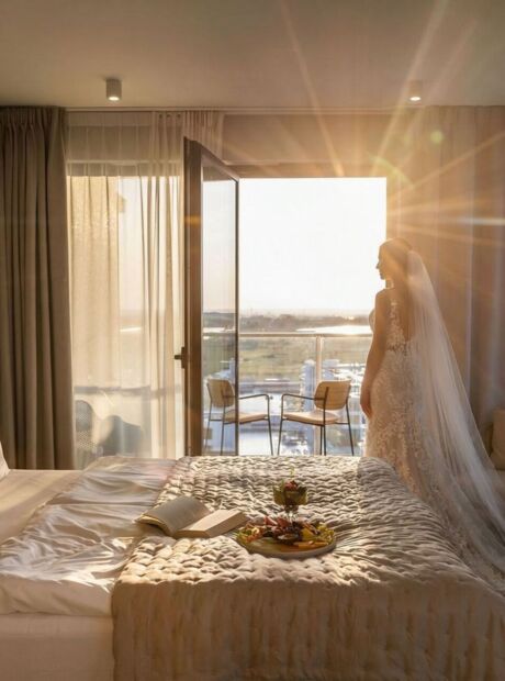 Honeymoon night in the most prestigious room of Grano Hotel**** Solmarina, located on the top floors, with a breathtaking view of the marina or the river. The perfect ending to your special day — in a space designed with luxury, intimacy, and unforgettable moments for two in mind.